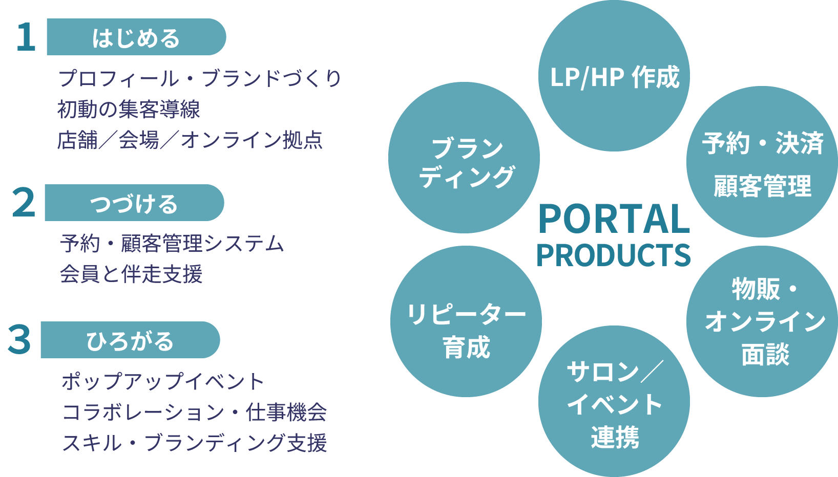 集客、予約、決済、顧客管理、LP作成、オンライン・オフライン対応の導線まで、オールインワンでパッケージ。